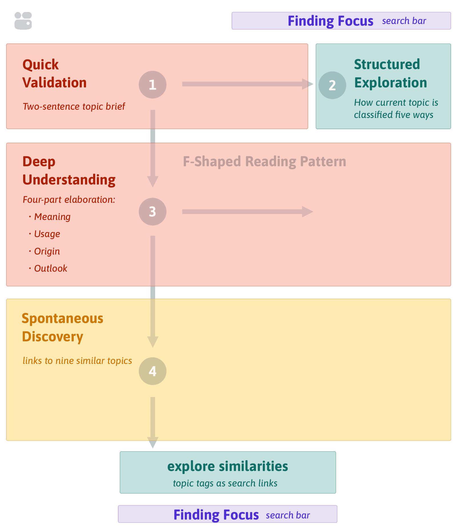 Illustrating how the design targets and supports four distinct modes of knowledge exploration—from initial search through discovery of related concepts.